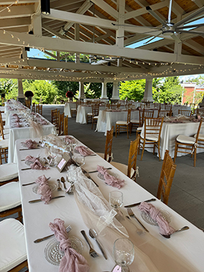 The Garden Marquee is our large event reception area, boasting 2,800 square feet of covered space for rental events. The Garden Marquee features overhead lights, ceiling fans and power plugs for bands, DJ’s and accent lights. The maximum table layout 184 chairs around 23 5'-round tables. Please note that you will need to rent tables and chairs from a local rental company for use in the Marquee.